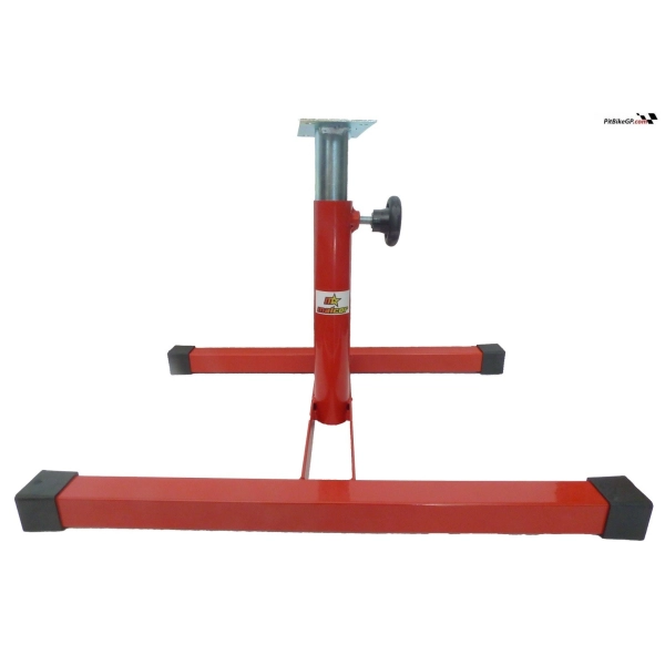 Caballete regulable en altura para Pit Bikes, ideal para trabajar con los motores fuera de la moto, ya que se atornilla el motor al soporte que se pude ver en la foto, con 4 tornillos. Regulable en altura con un mínimo de 25cm y un máximo de 40cm.