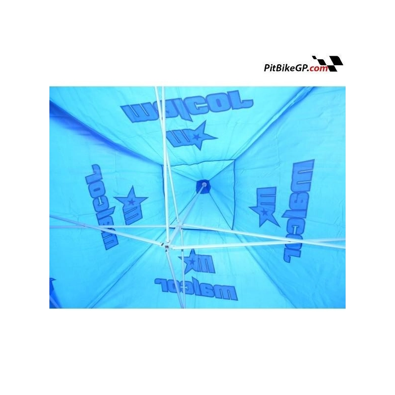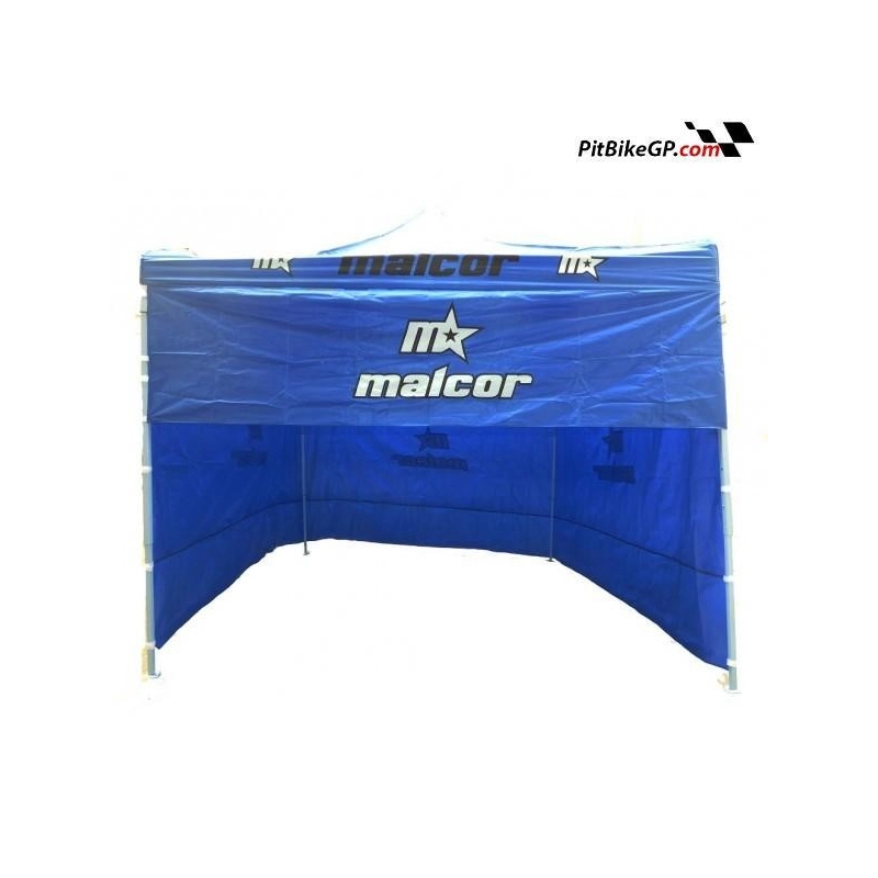 Carpa con estructura de acero,color azul con publicidad de MALCOR. Tiene 4 laterales para cerrarla completamente y aparte una banda más estrecha para poner en la zona de arriba para evitar el sol.