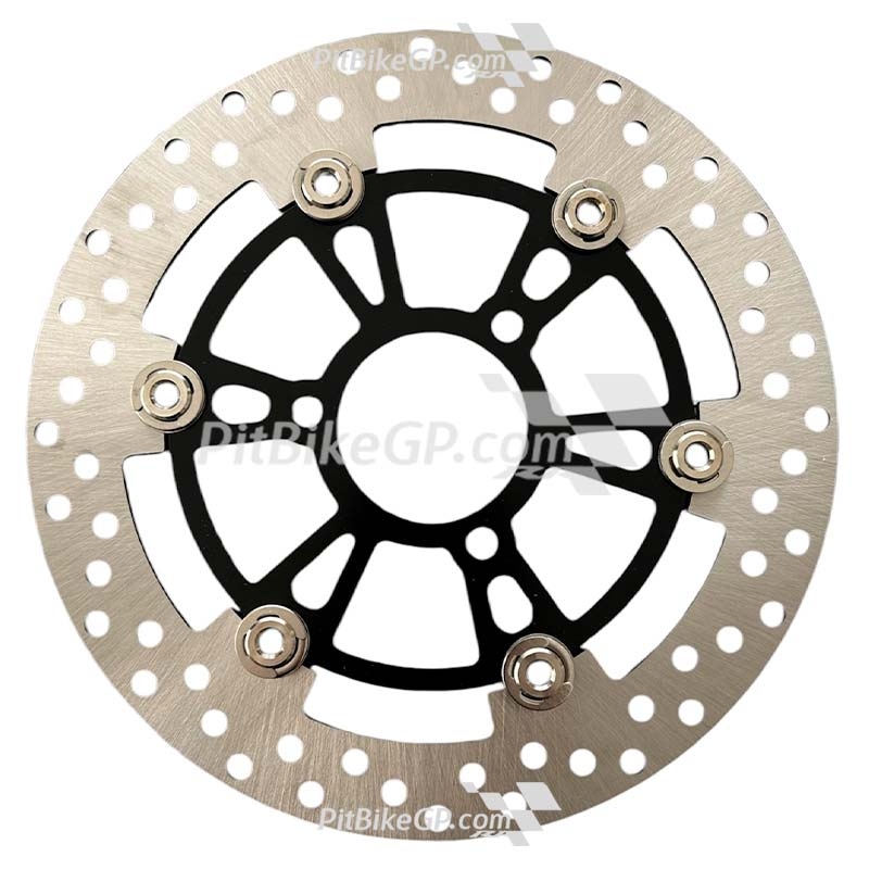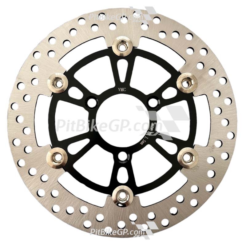 Actualiza el sistema de frenado de tu pit bike o miniGP con este disco flotante sobredimensionado de 230 mm y montaje 3-pernos, compatible con llantas tipo VMC / Ayrton / Malcor MTR de 3 tornillos.