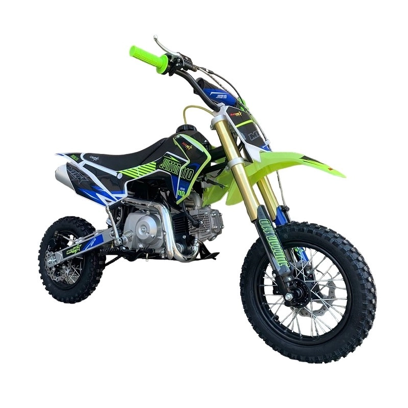 Minicross infantil MTR Malcor Junior, con motor 4T y 110cc. semiautomático. Recomendada para niños desde los 7 años de edad, tiene 67cm del asiento al suelo y llantas 12-10 pulgadas.